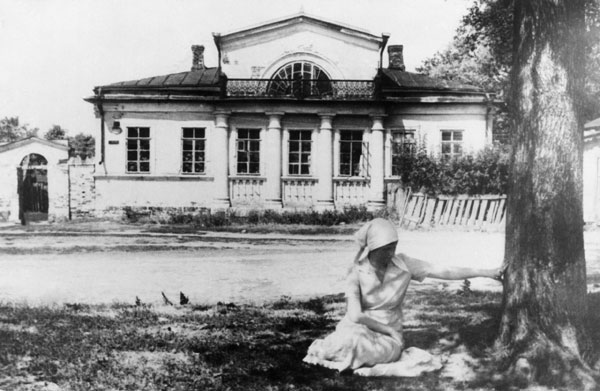 У меня сохранилось несколько бегло сделанных [в Коломне] Горнунгом фотографий — на одной Анна Андреевна сидит на скамеечке возле какого-то ничем не примечательного домика, просто отдыхает, был жаркий день. На другой наши совсем миниатюрные облики запечатлены на фоне Троицких ворот, с которых тогда еще не была содрана большая надвратная икона в барочном обрамлении. На третьей фотографии Анна Андреевна сидит на траве под деревом, за которым виден старый «уездный» особнячок; по одному изгибу прекрасной руки легко можно узнать величественную модель. Снята она как раз в светло-розовом платке, том самом, который стал, для меня по крайней мере, неким ее «старковским» атрибутом.