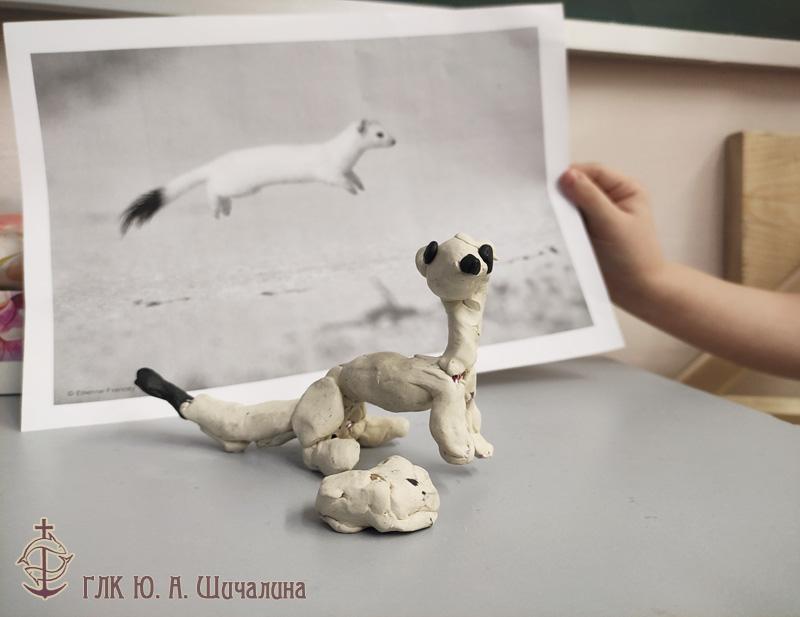 Дети лепили белых горностаев в зимней шубке. Один из них даже поймал мышку.
