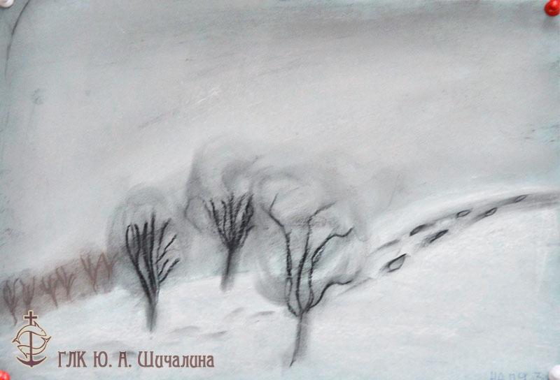 «Зимние пейзажи». Рисунки пастелью и соусом. Январь 2019